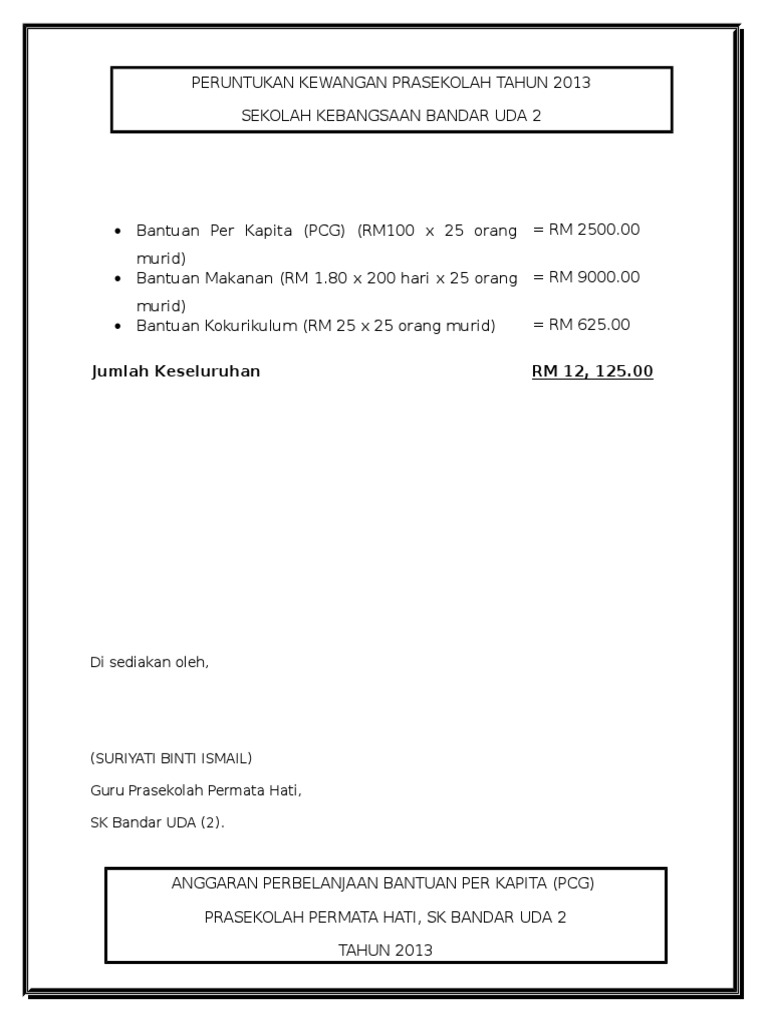 Contoh Anggaran Perbelanjaan Peruntukan Wang Perkapita Prasekolah Pdf